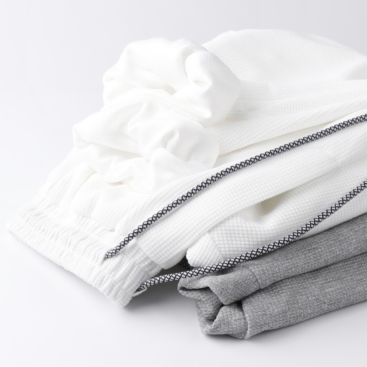 定番のスウェットパンツに飽きたら、このワッフル生地のパンツを。軽くて通気性が良く、汗をかいても速乾性が高いので、スポーツシーンでも活躍します。
