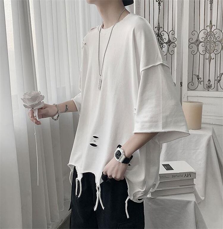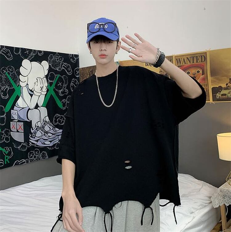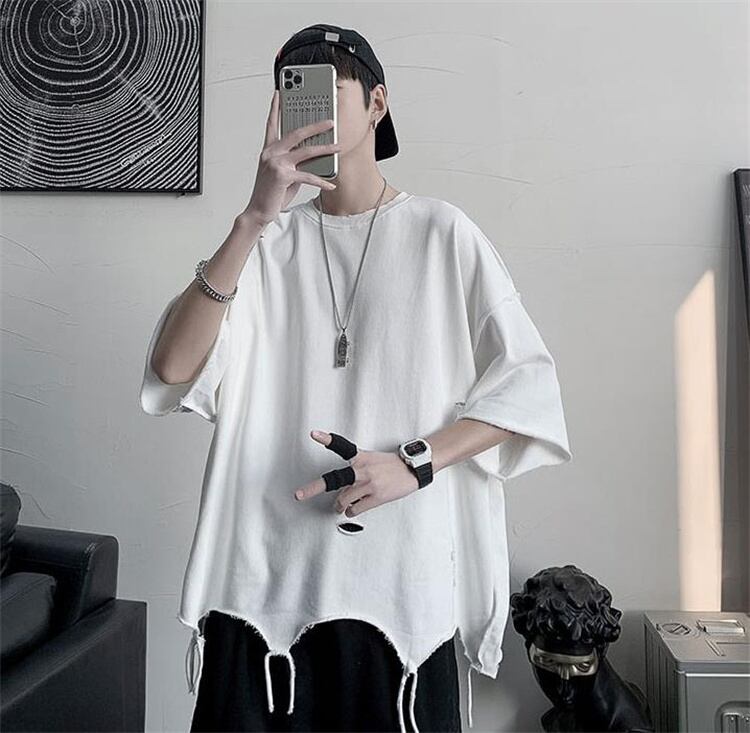 オシャレに体型カバー 夏 ストリート Tシャツ破れ 半袖 肌にやさしい カジュアル トップスは、洗練されたデザインと快適さが魅力の一枚です。破れデザインがおしゃれで、トレンド感のあるスタイリングにぴったり。カジュアルながらも上品な印象を与えるストリートファッションに最適です。