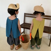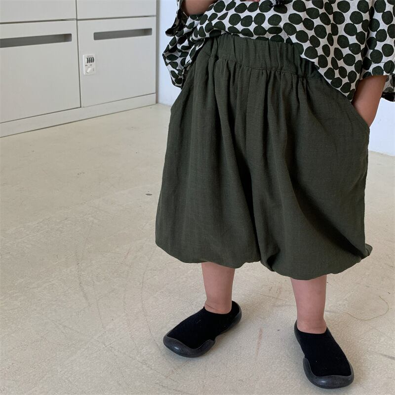 当店お勧めの春夏新作、男女兼用のワイドパンツです。七分丈のズボンとサルエルパンツの要素を取り入れたおしゃれなデザインで、注目の韓国風子供服としてもオススメです。素材には麻と綿をブレンドさせた麻綿素材を使用し、清涼感と通気性に優れた穿き心地を実現しました。カラーは2色展開で、レトロな色味が季節感を引き立てます。